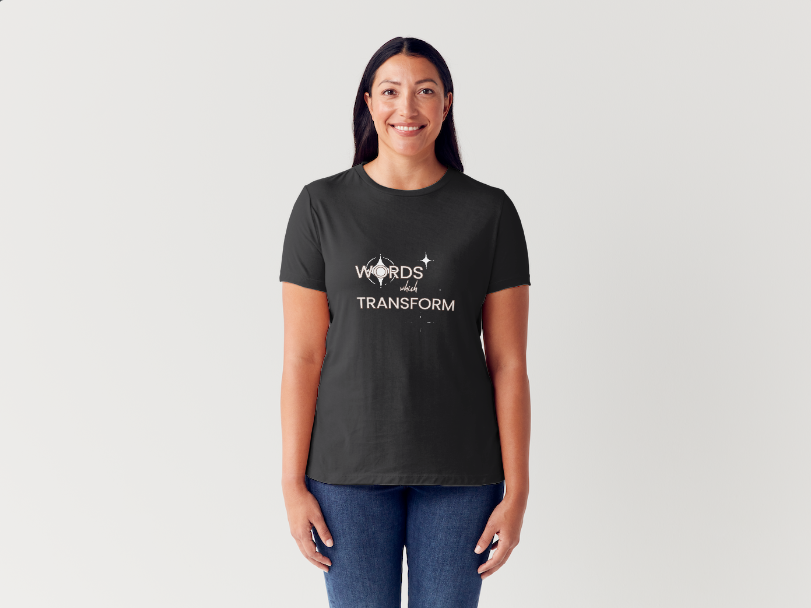 un tricou de damă negru cu "Words Which Transform" scris pe el, mărime M (disponibile fiind şi mărimile L şi XL)
